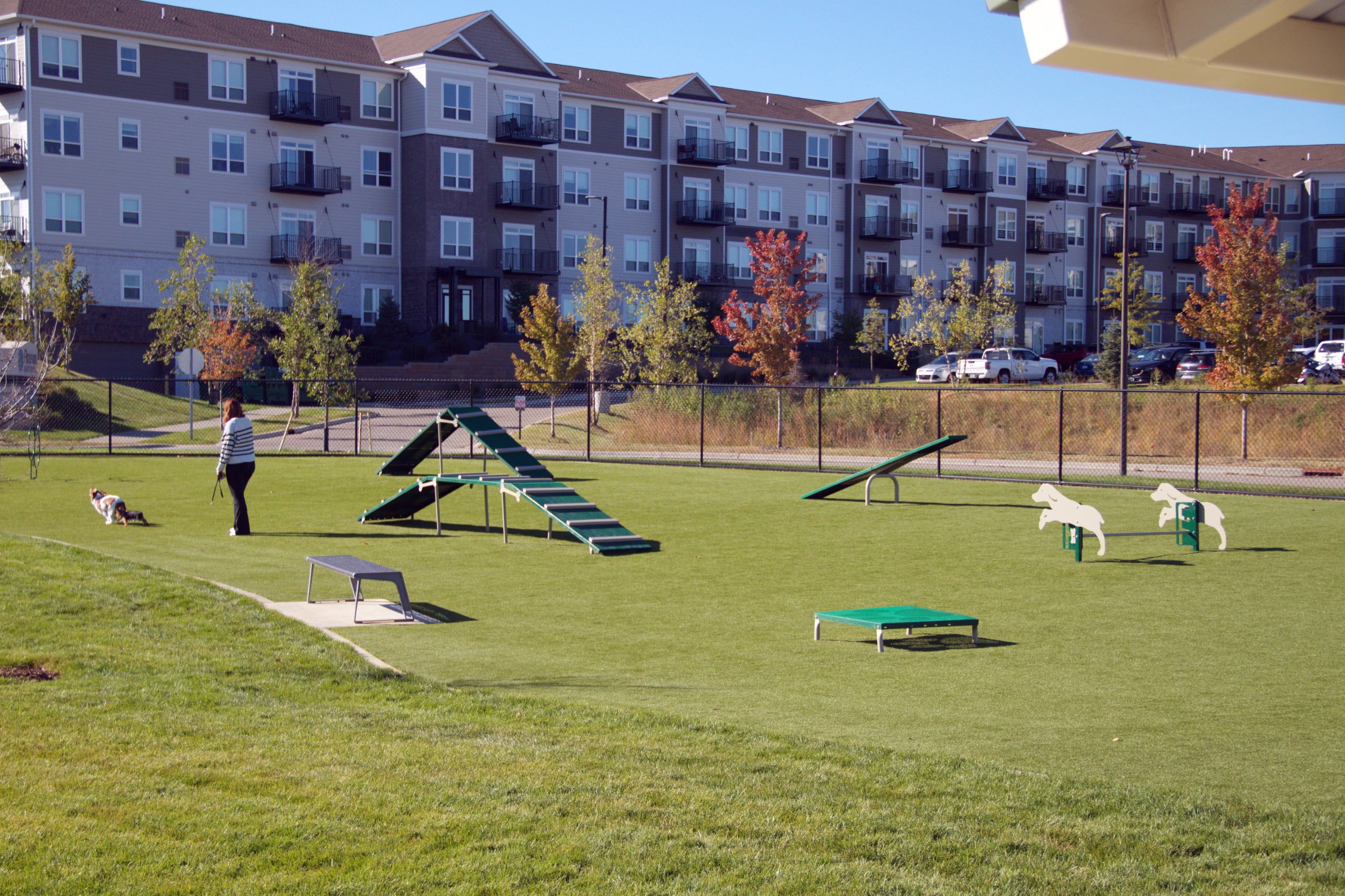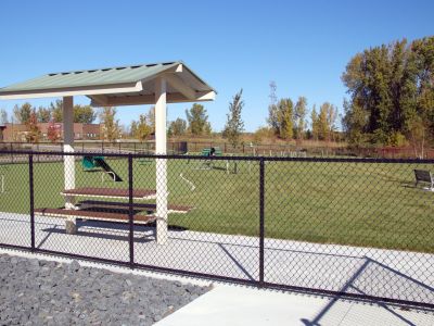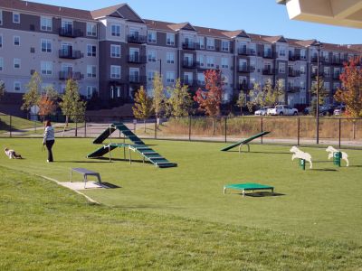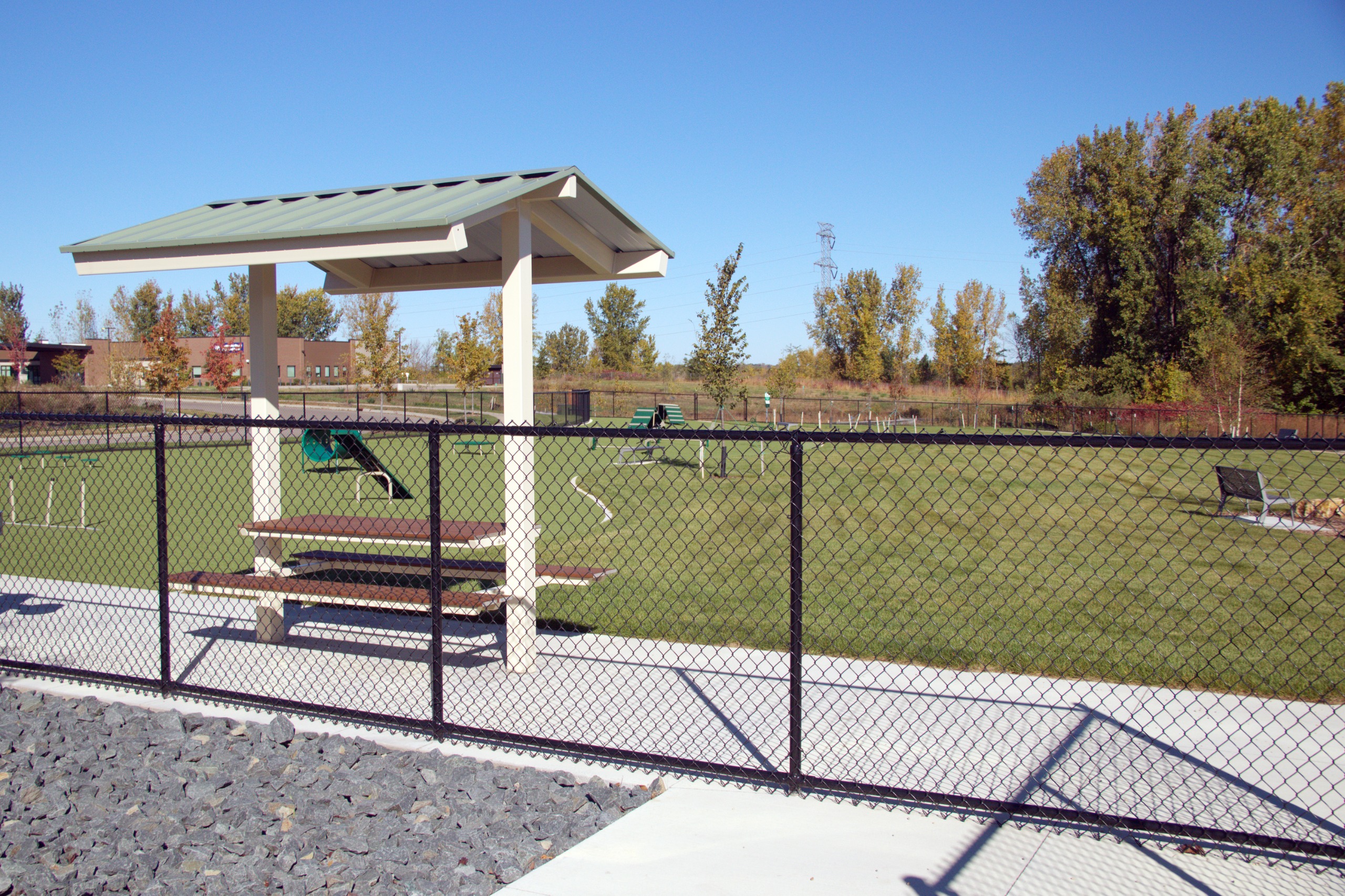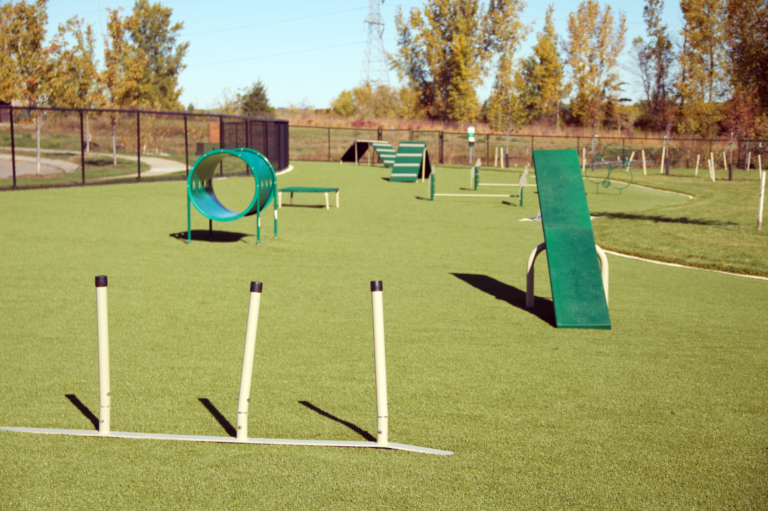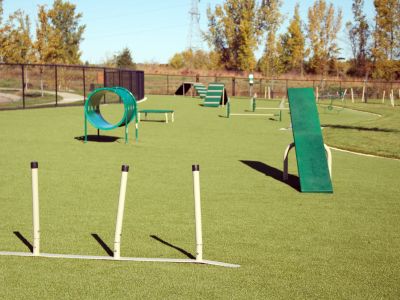 The park has separate areas for large and small dogs to ensure the safety and comfort of both dogs and their owners. Each area will offer open space and equipment suited to different sizes and ability levels. The ground features a mix of grass, turf, and gravel to give dogs a variety of surfaces to explore.